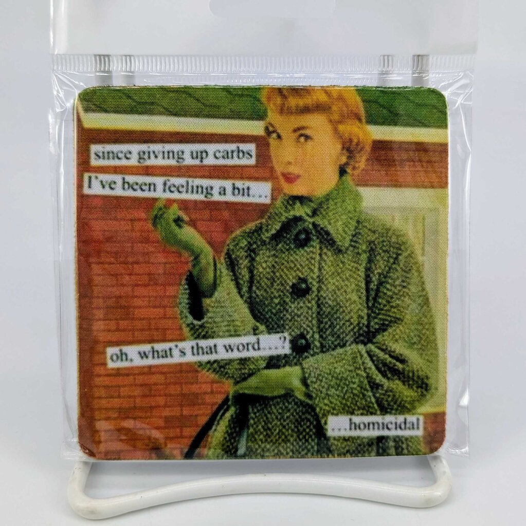 Since giving up carbs I've been feeling a bit...oh, what's that word...? ...homicidal Wicked Witty Gifts Share Deel Messenger Email Since giving up carbs I've been feeling a bit...oh, what's that word...? ...homicidal Wicked Witty Gifts Share Deel Messenger Email Product form MAGNETS - Refrigerator Magnets | SKU: 43AUGG Free pickup in store! Free pickup in store! Color Coaster 4x4 Condition New $4.99 Quantity Add to cart