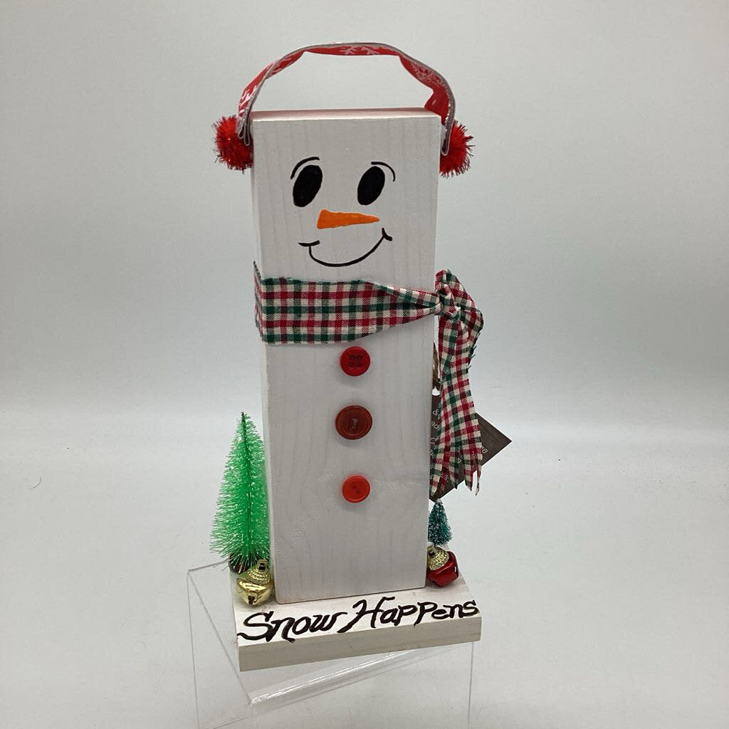 Handmade wooden snowman in a whimsical square shape decorated for the season with "Snow Happens" message. Cute home decor item...