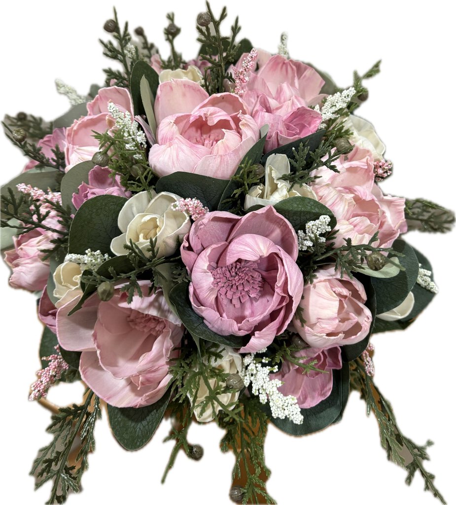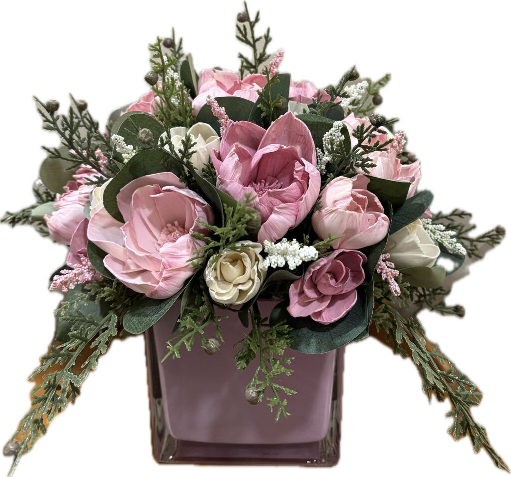 Sola Wood Peonies in Pink in a Pink Square Vase
