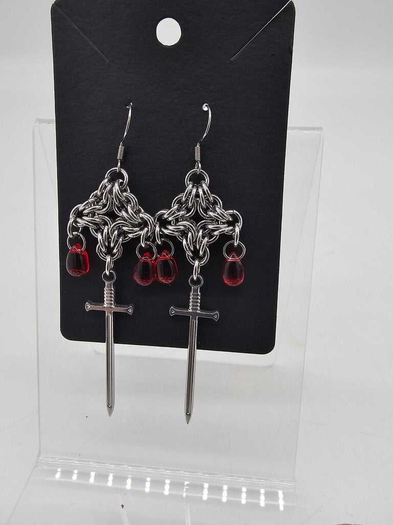 Stainless Steel Byzantine Diamond with Sword and Red Drops Earrings Gray Cat Manor Designs Share Deel Messenger Email Stainless Steel Byzantine Diamond with Sword and Red Drops Earrings Gray Cat Manor Designs Share Deel Messenger Email Product form EARRINGS | SKU: ZC8AZA Free pickup in store! Free pickup in store! Size Free pickup in store! 3 inches long, 1 inch wide Color Free pickup in store! silver, red Condition Free pickup in store! New $25.00 Quantity Add to cart