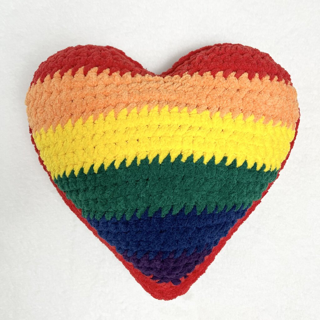 Crochet heart pillow. Made with blanket yarn (polyester). Spot clean as needed. Approx 11" x 11".