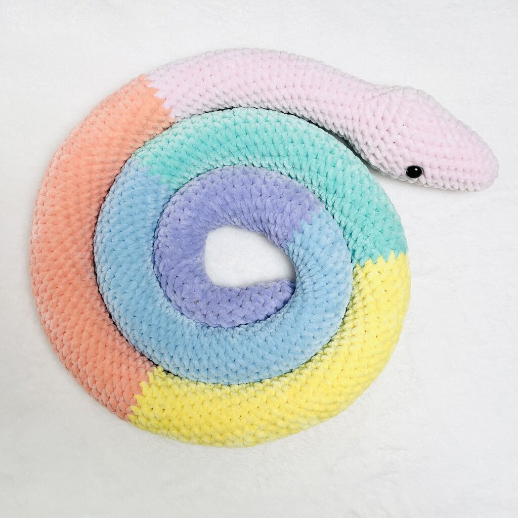 Crochet stuffed snake Made with chenille yarn (polyester). Spot clean as needed. Approx 84" long