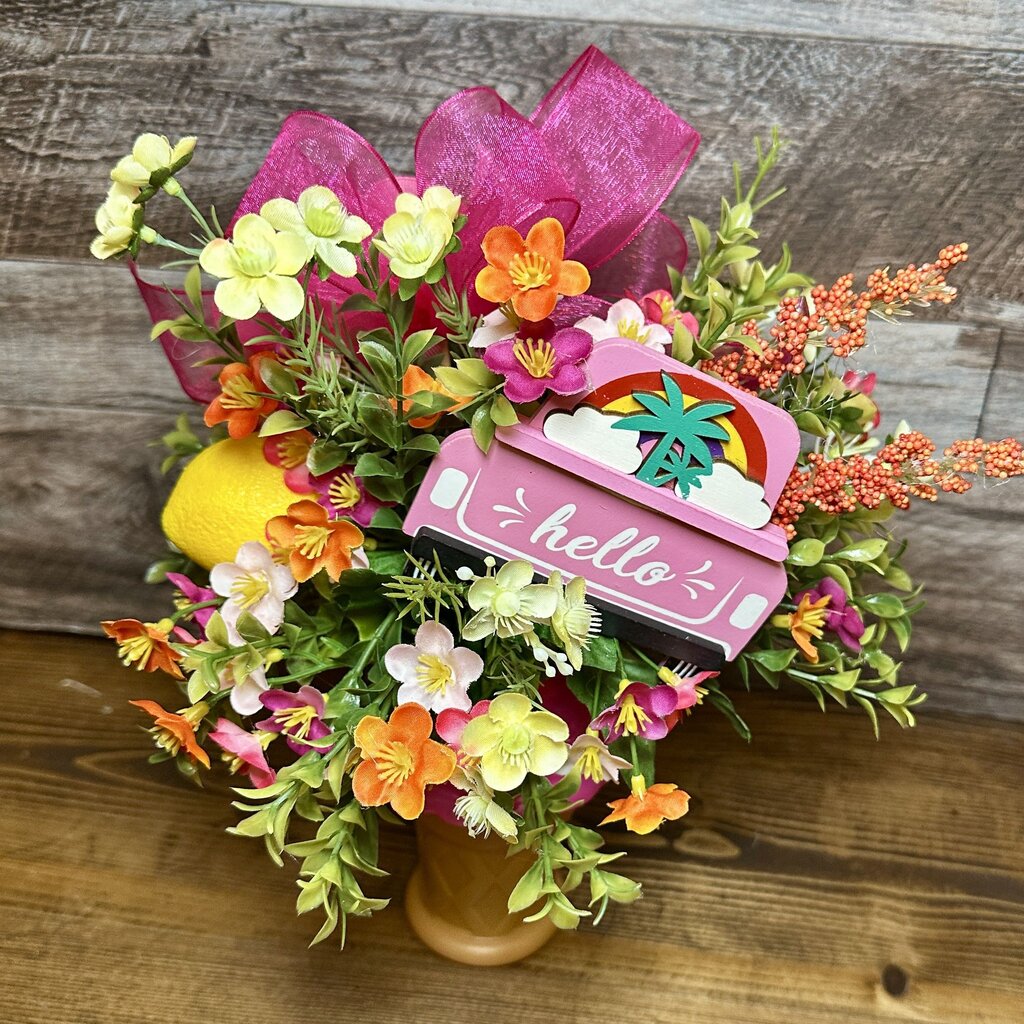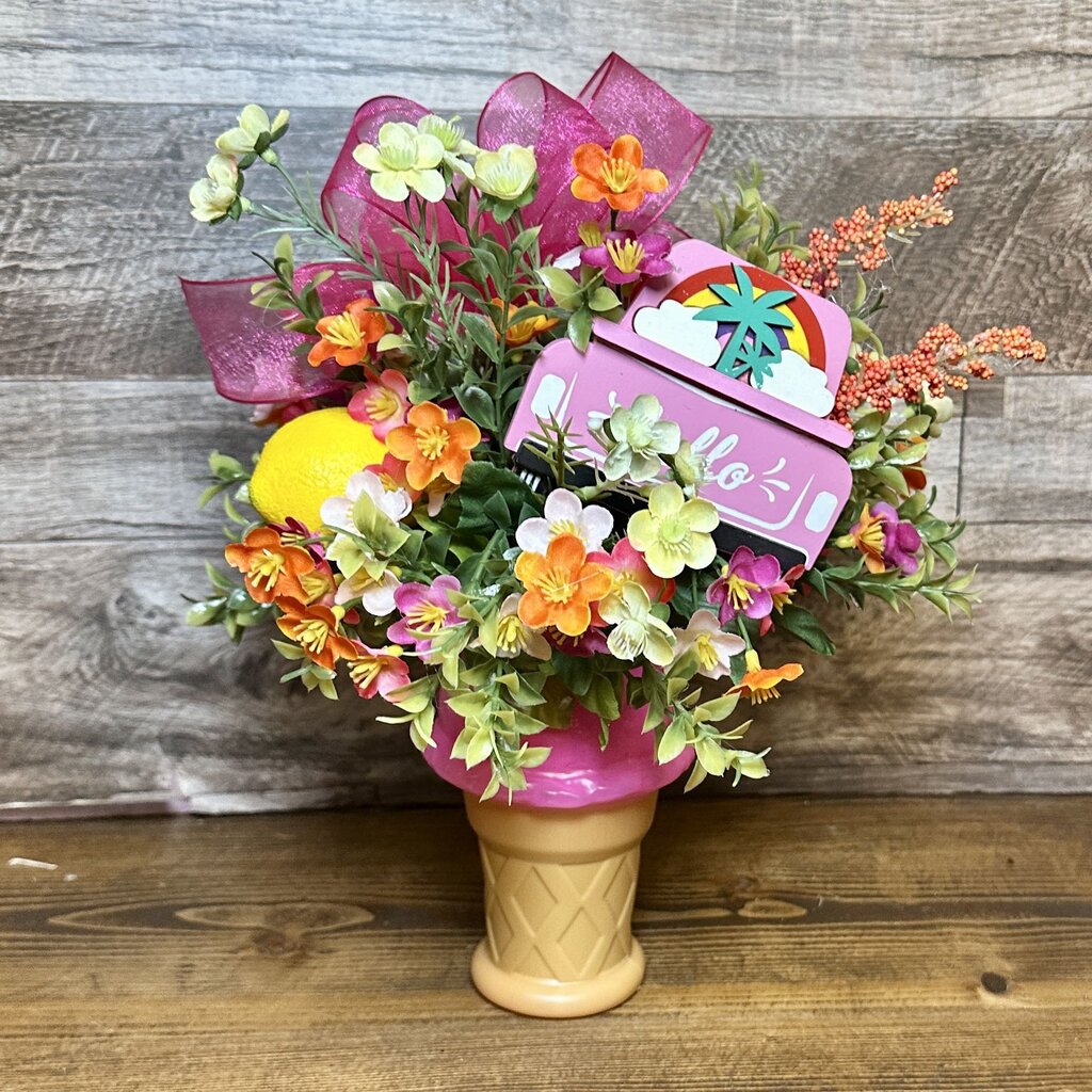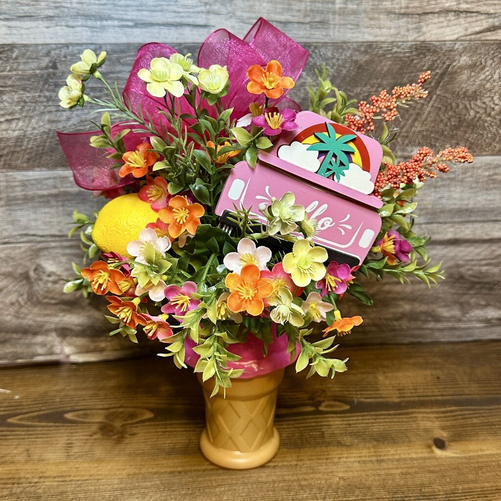 Summer Ice Cream Cone Floral Arrangement - Pink Hello Truck & Lemon Accent