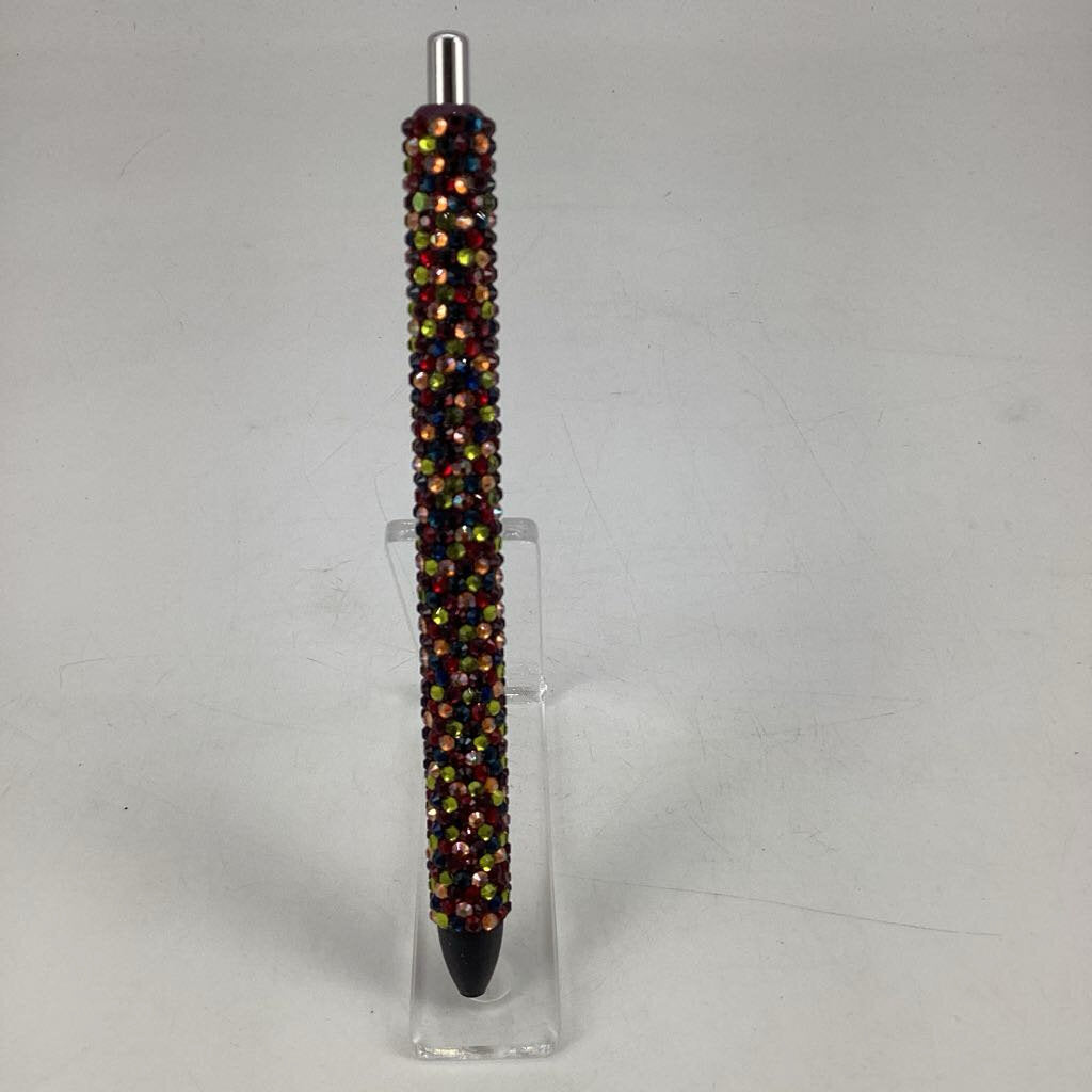 This pen was created by individually applying each rhinestone one by one! The ink color is represented by the color of the tip of the pen, with a blue ink refill included. Full rhinestone pens are created using a Paper Mate Ink Joy Gel pen as the base. The grip pens use Sharpie S Gel pens as a base.