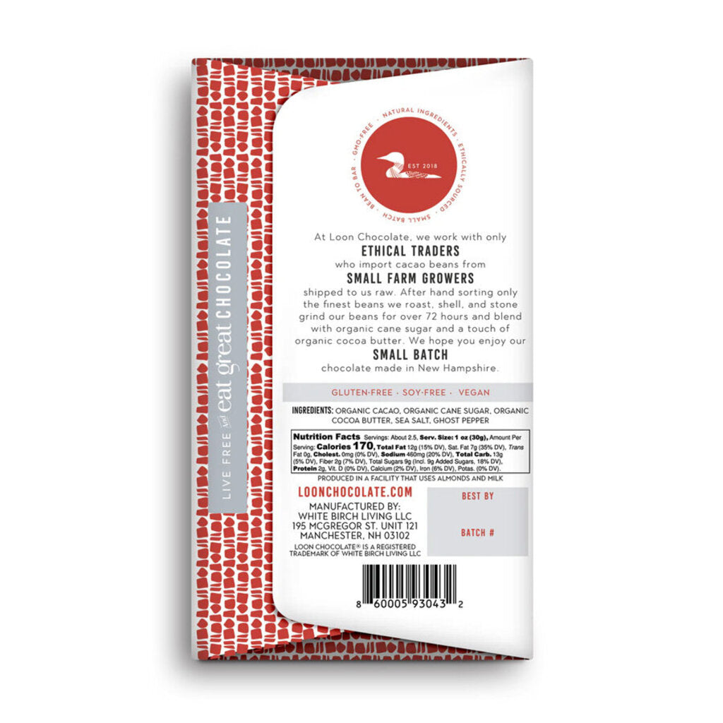 70% Dark Chocolate with Chocolate Ghost Peppers (Bhut Jolokia Chocolate), and sun dried Maine Sea Salt. This is a fun play on your senses-first sweet then salty then heat! (spice level is like medium to hot salsa level)