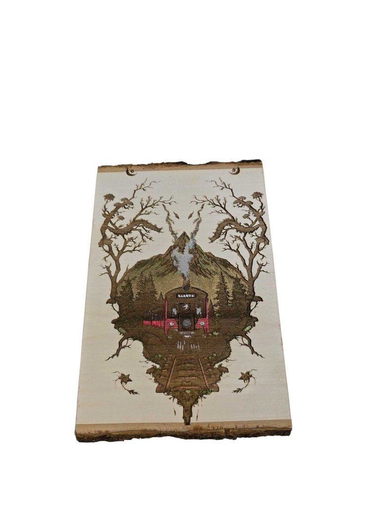 Engraved into the wood and handpainted. Sawtooth hanger on the back