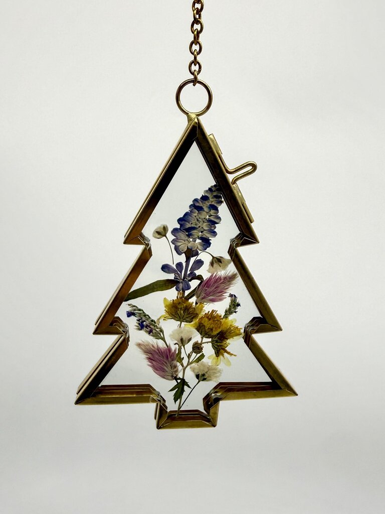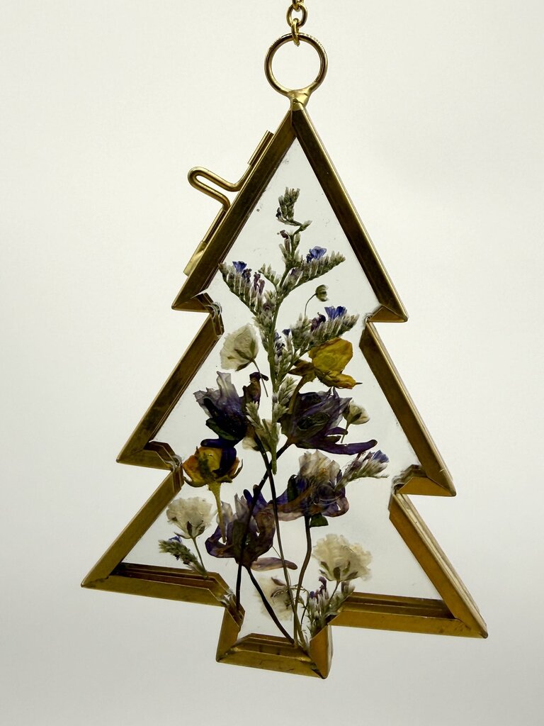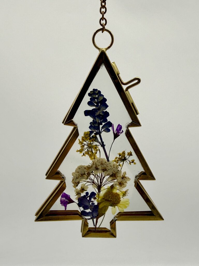 4 inch long Christmas tree ornament with various pressed florals