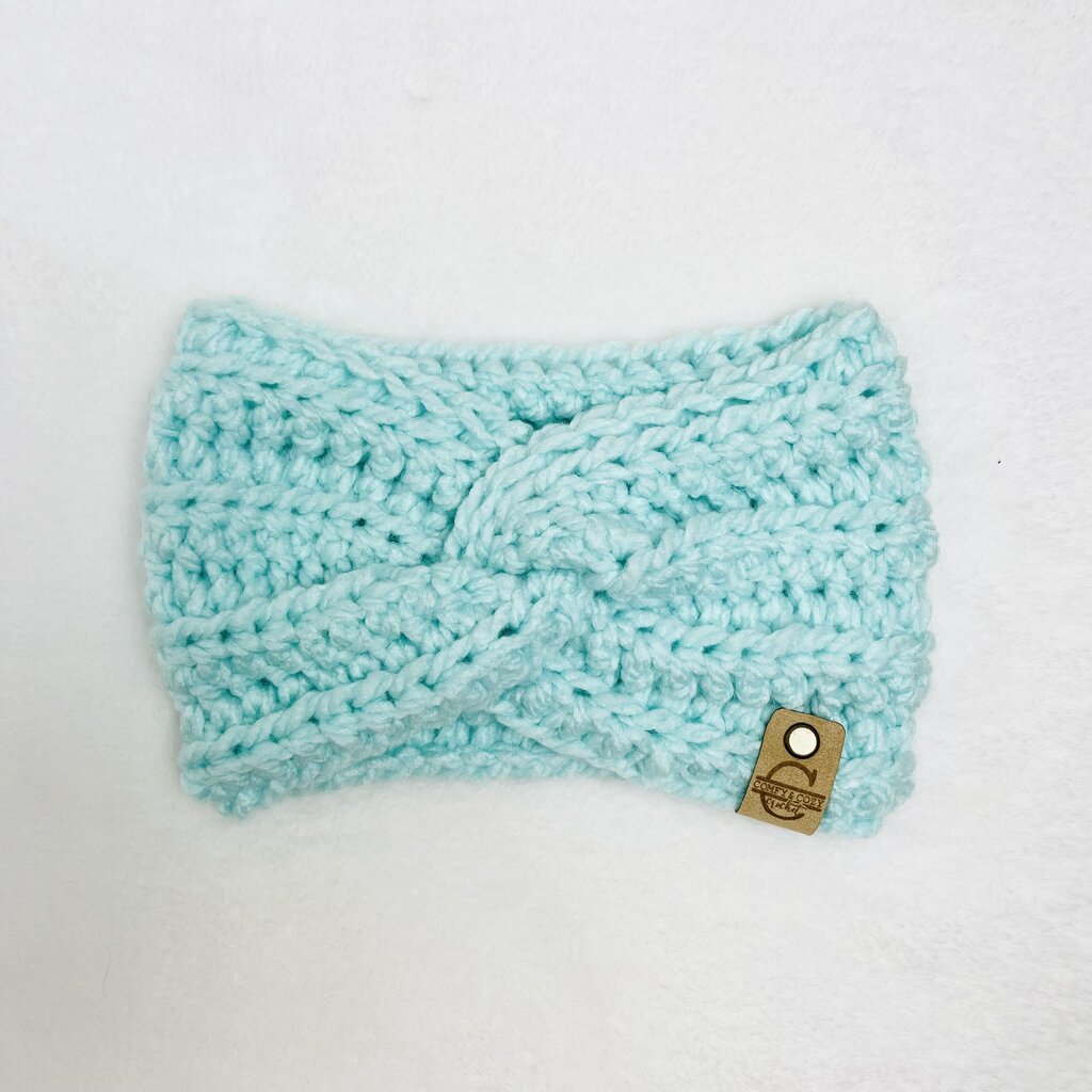 Crochet winter headband/ear warmer made with acrylic yarn. Machine wash gentle. Lay flat or tumble dry low heat.