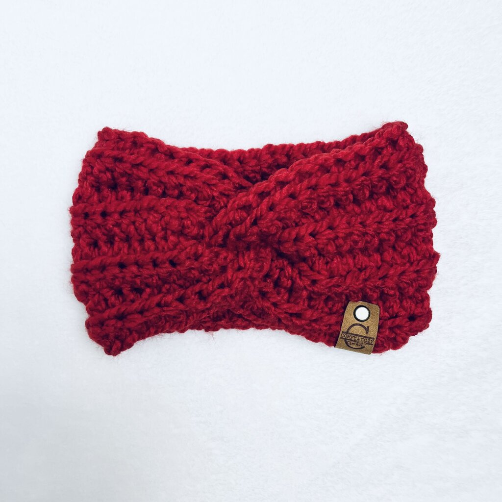 Crochet winter headband/ear warmer made with acrylic yarn. Machine wash gentle. Lay flat or tumble dry low heat.