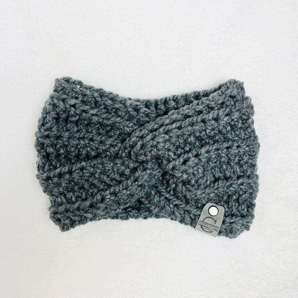 Crochet winter headband/ear warmer made with acrylic yarn. Machine wash gentle. Lay flat or tumble dry low heat.