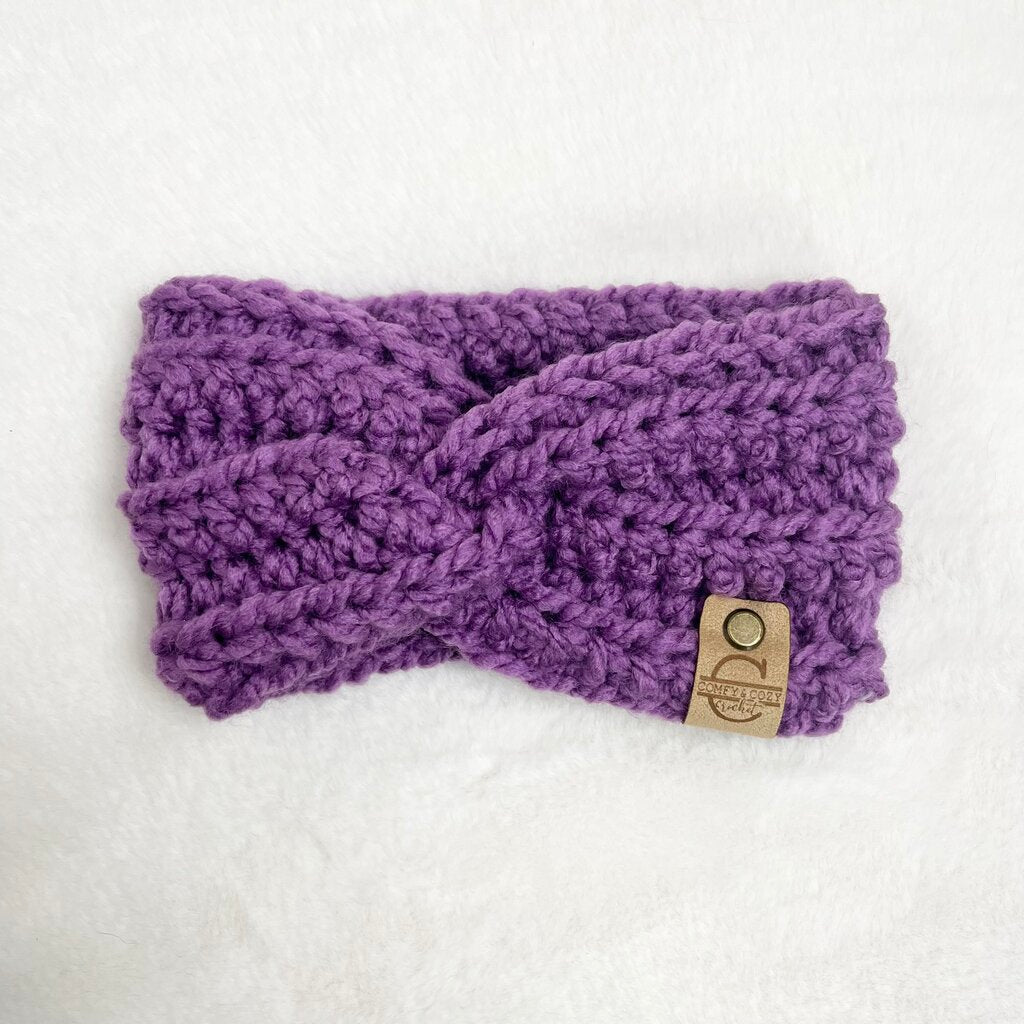 Crochet winter headband/ear warmer made with acrylic yarn. Machine wash gentle. Lay flat or tumble dry low heat.