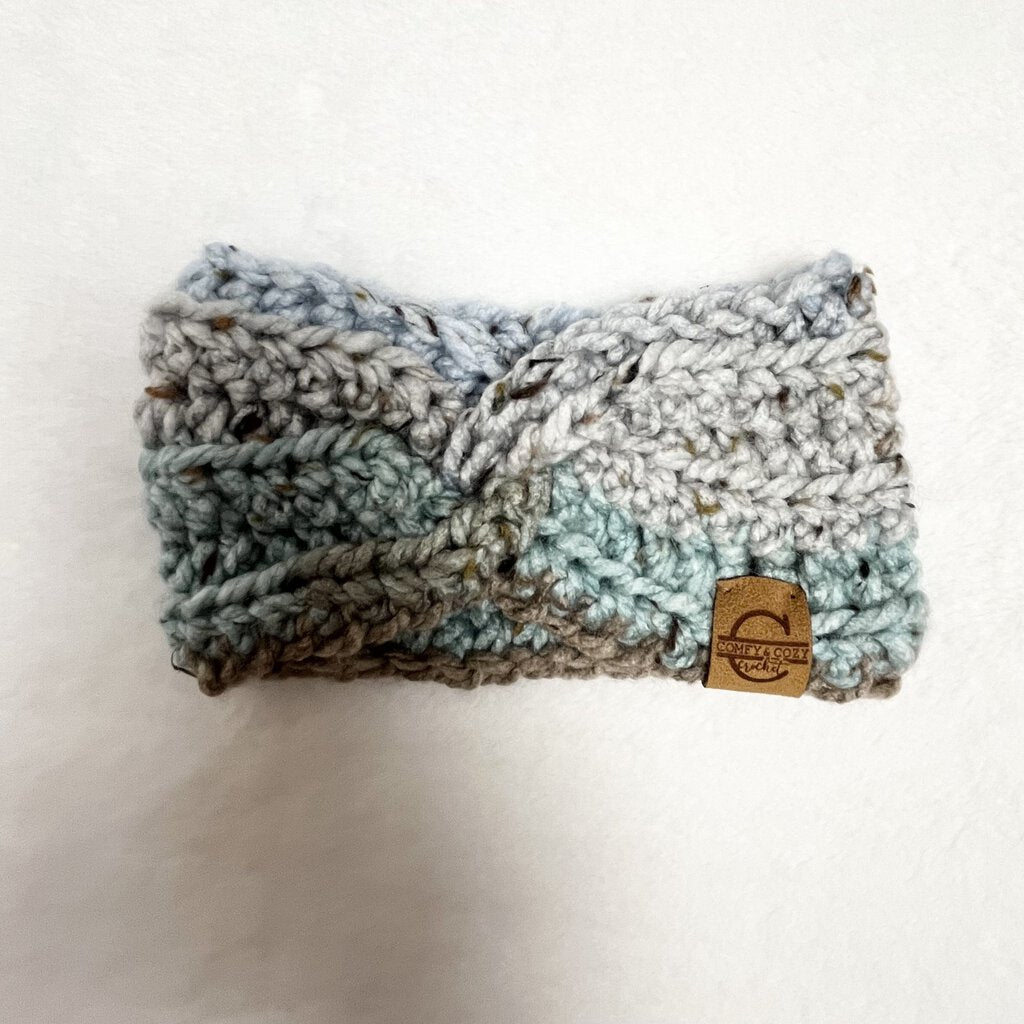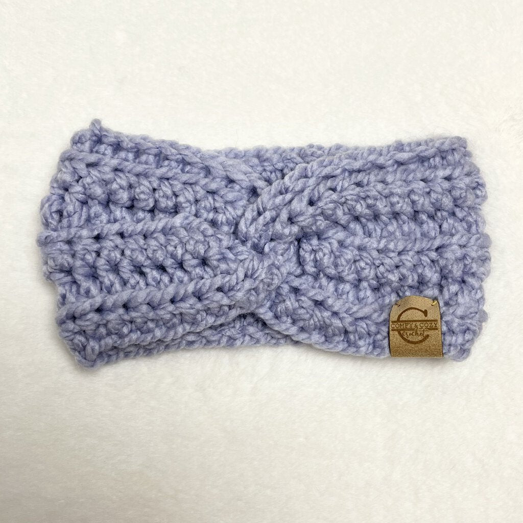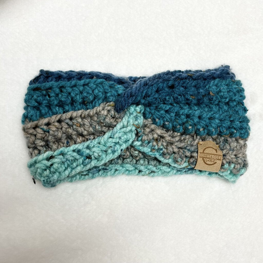 Crochet winter headband/ear warmer made with acrylic yarn. Machine wash gentle. Lay flat or tumble dry low heat.
