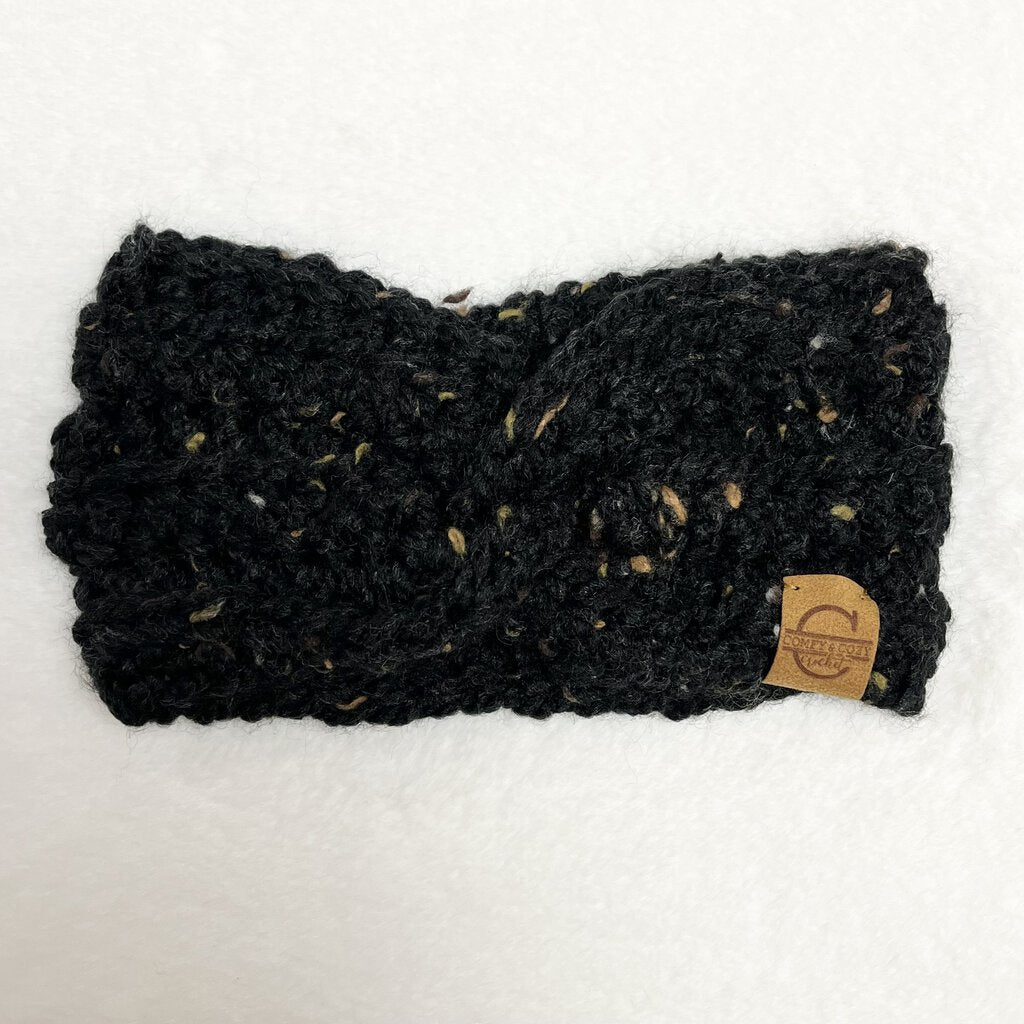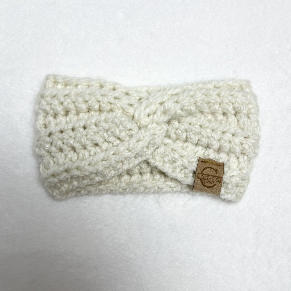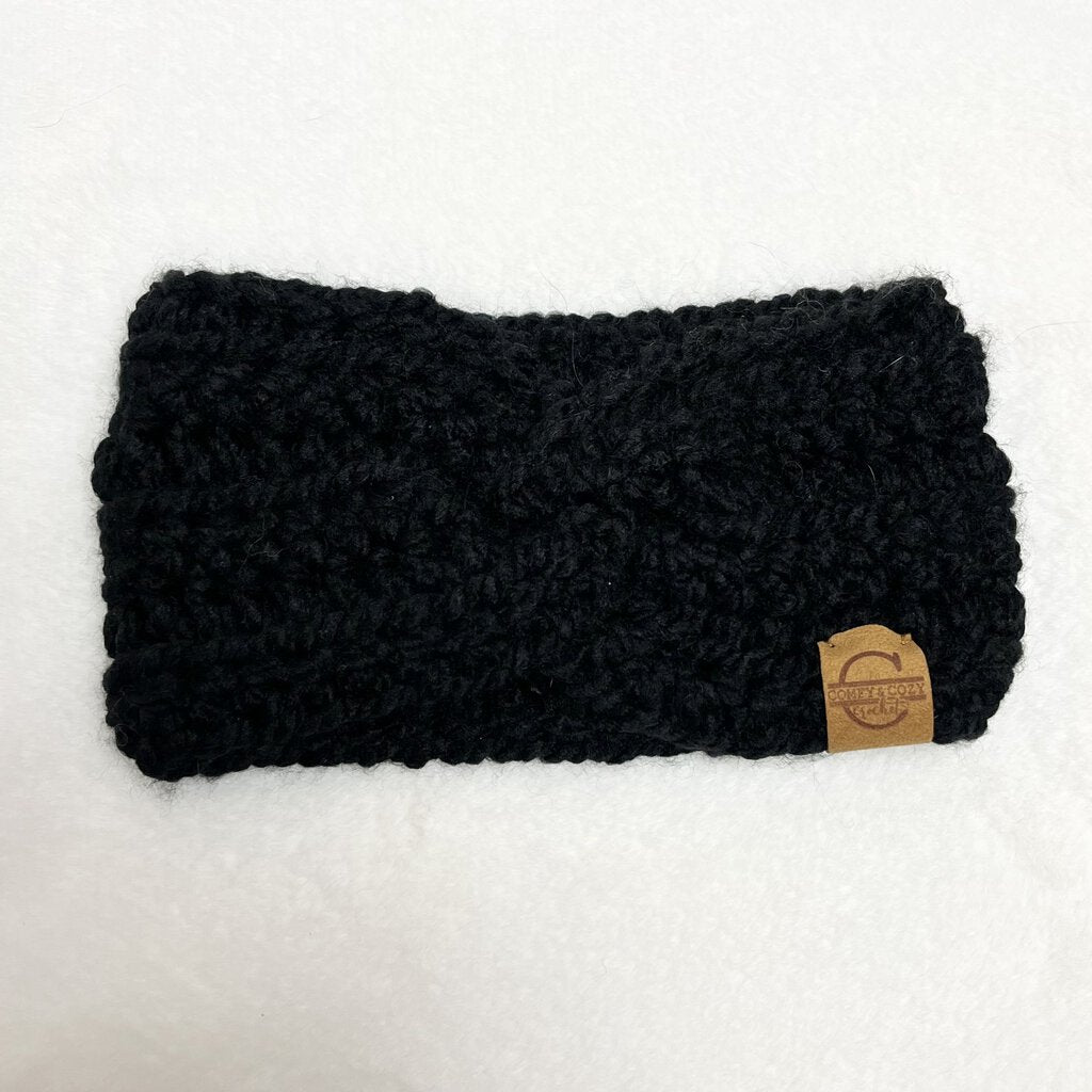 Crochet winter headband/ear warmer made with acrylic yarn. Machine wash gentle. Lay flat or tumble dry low heat.