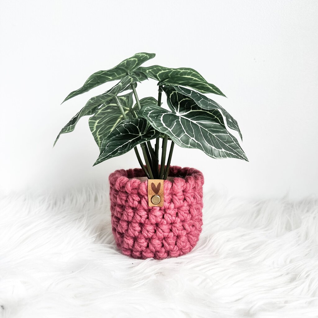 Bring a little love and greenery into your space with this charming faux houseplant, nestled in a handmade crochet plant cozy in a cozy raspberry-pink hue. The cozy is finished with an engraved vegan leather heart tag, adding a sweet, love-inspired touch to your decor. Perfect for desks, shelves, or Valentine's Day gifting. No watering required, just instant charm and warmth.