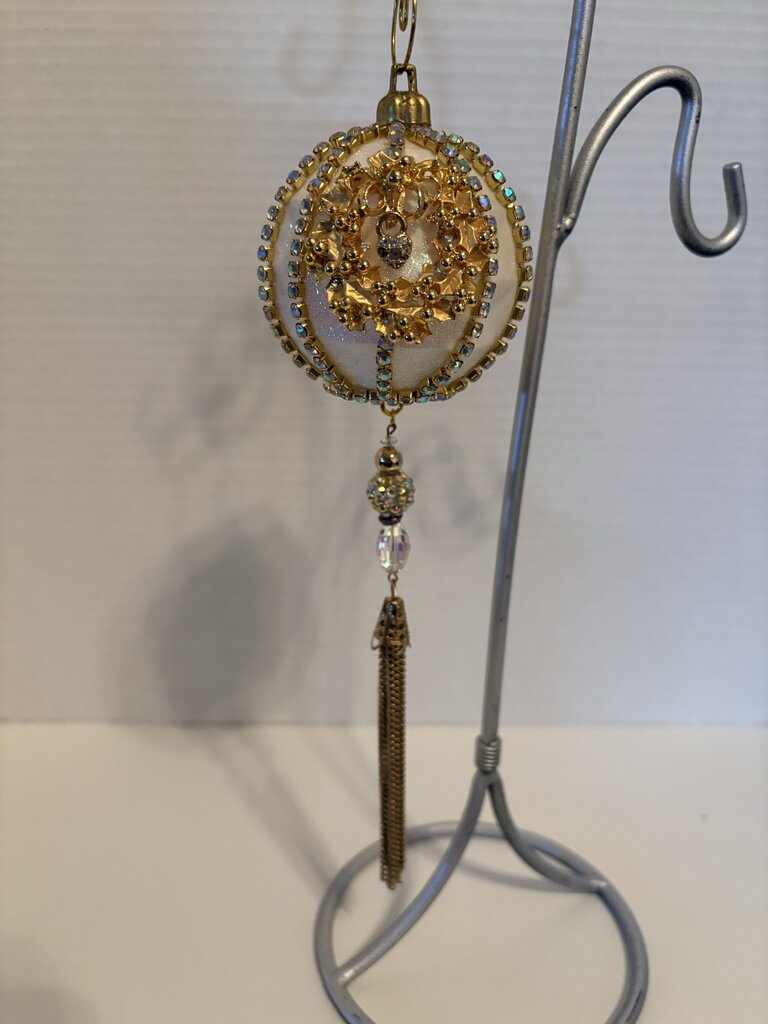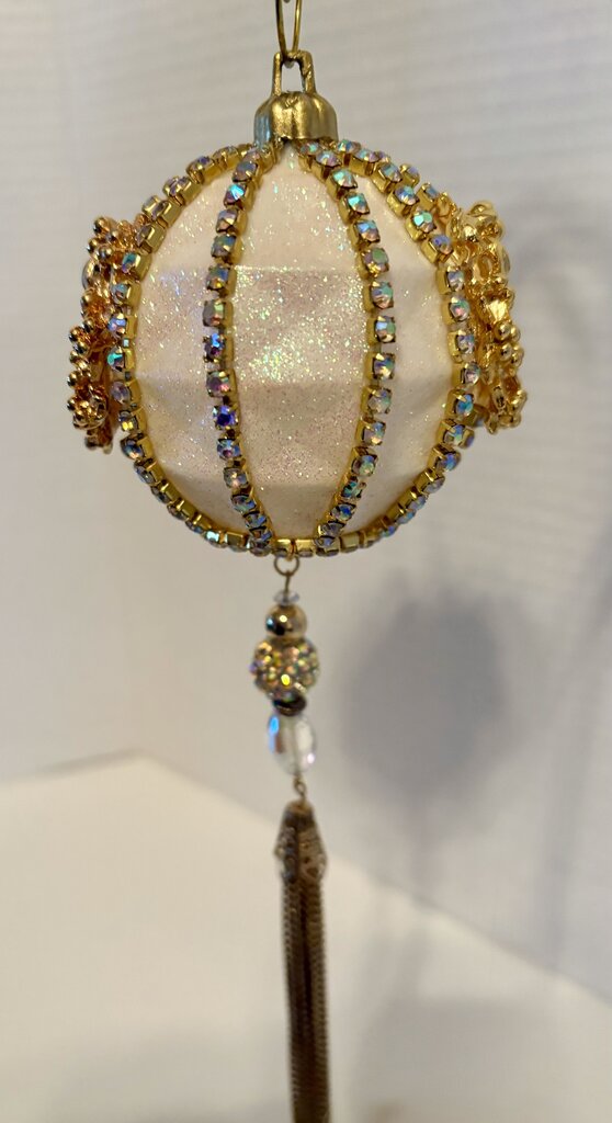VTG cream glitter ORNAMENTw/ rhinestones & gold wreaths & hanging ornate beaded chai