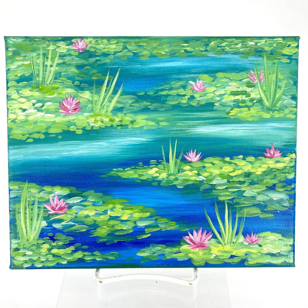 Blues and greens blended with little pink lotus flowers. A little lily pond to bring home with you.