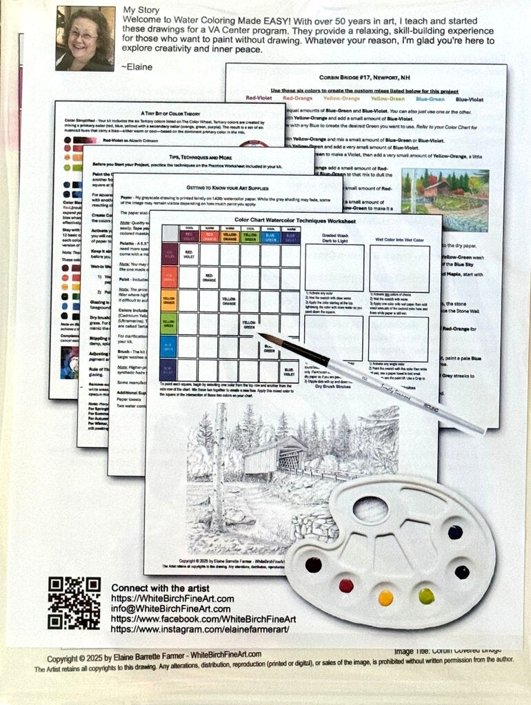 WATERCOLOR ART LESSON KIT - Perfect for the beginner - Learn watercolor by making your own artwork. - Kit includes all you need for two projects - Two sizes 5"x7" & 8"x10" standard sizes, printed on heavy 140lb. watercolor paper - 6.5" x 9" Mixing Palette with Six dry Winsor & Newton Cotman watercolors loaded - Simply Simmons No. 8 round brush - Color chart and practice page on watercolor paper - Step-by-step Instructions with color mixing recipes - Bonus: A Tiny Bit of Color Theory - Tips and Techniques plus a finished picture for reference Ages 10+