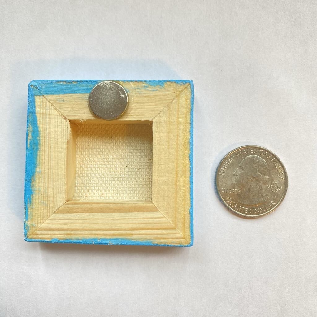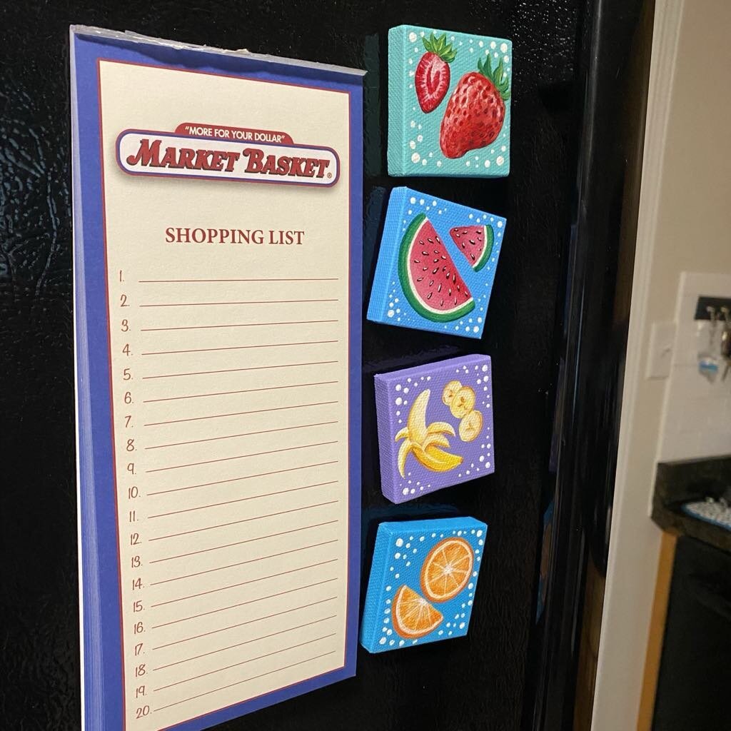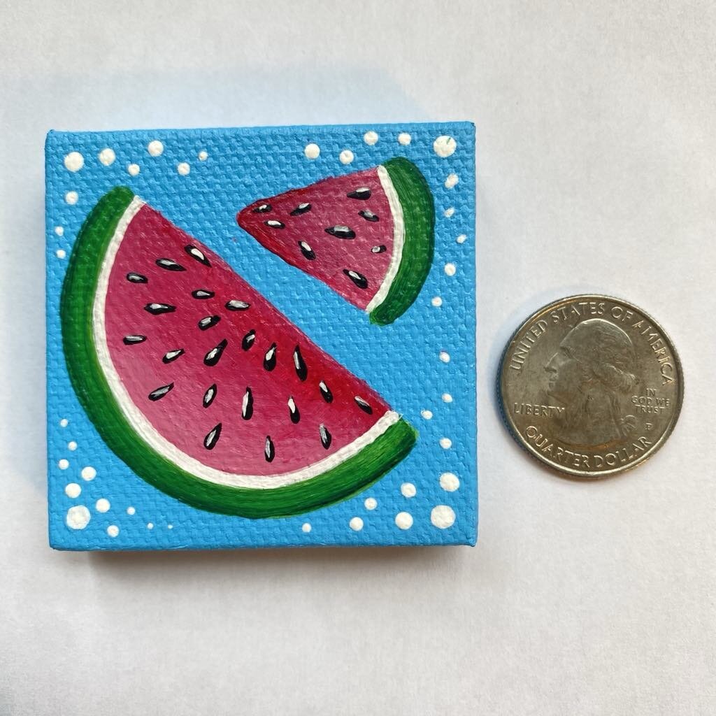 2x2 miniature canvas hand painted with acrylic paints. Detail of a sliced watermelon. Pinks, Greens, Blues