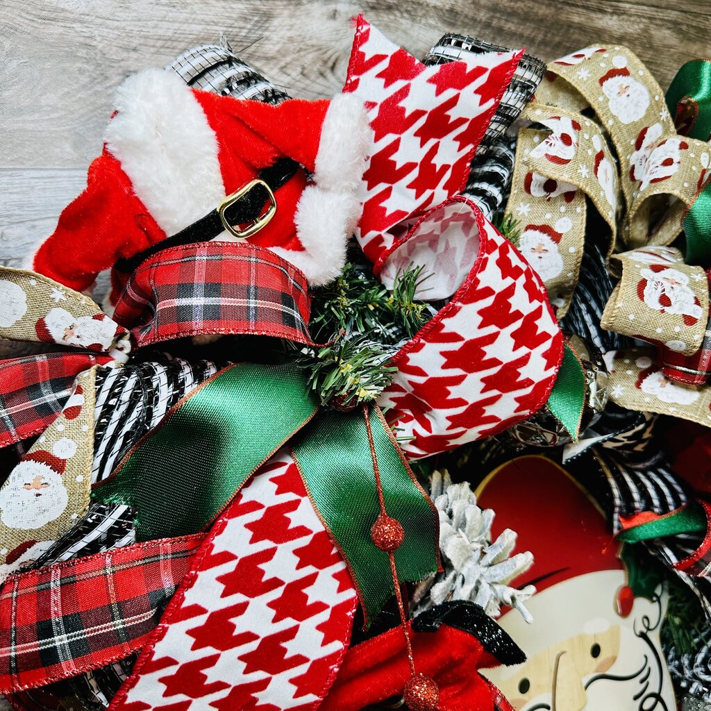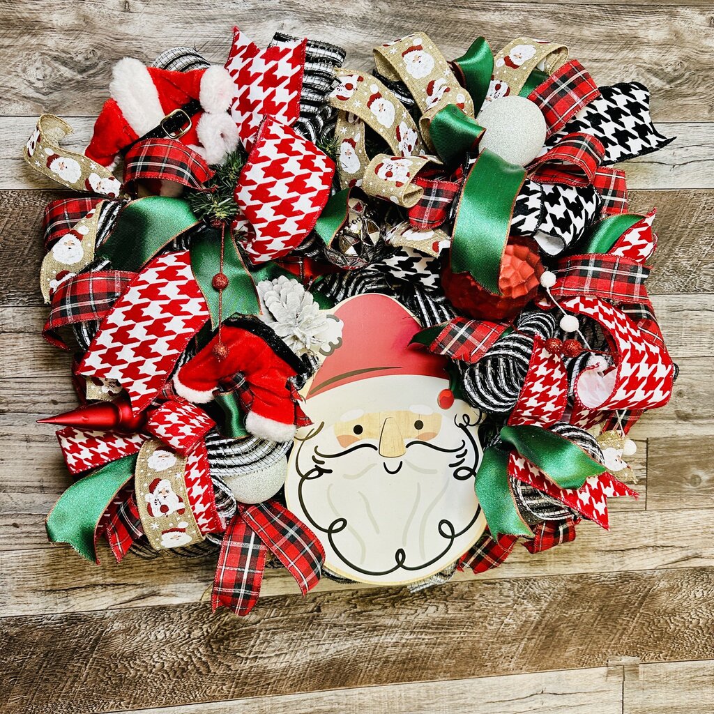 Bold and festive wreath featuring a Santa focal, layered ribbons, and playful holiday textures A cheerful statement piece for front...