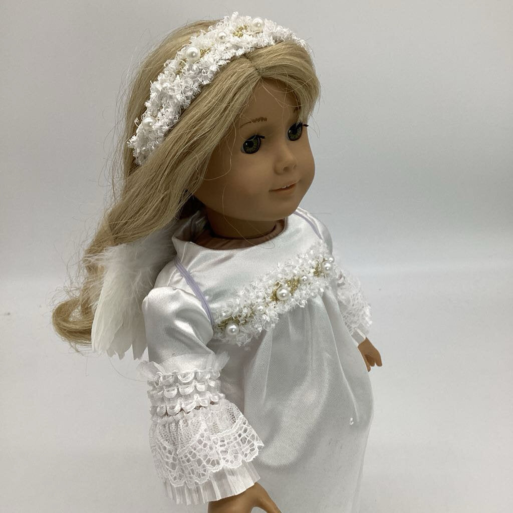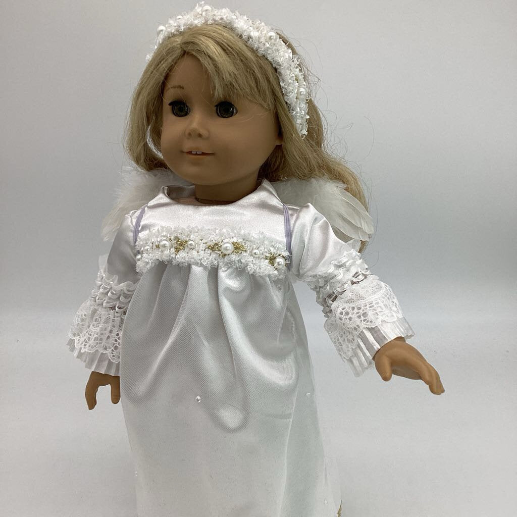 A white angel dress with angel wings and fluffy headband to match the dress. The dress is long. The bodice is fully lined. The front has a fluffy trim going across the chest area in white, gold and some white pearls. The bottom skirt is satin with tulle overlay with a few rhinestones scattered. The sleeves are flared around the hand with a beautiful lace. The bottom hem has a gold trim with small white pompoms. The dress closes in the back with Velcro. To complete this angel outfiit I added wings with elastic for the arms and headband with the same decorative trim as the front of the dress.