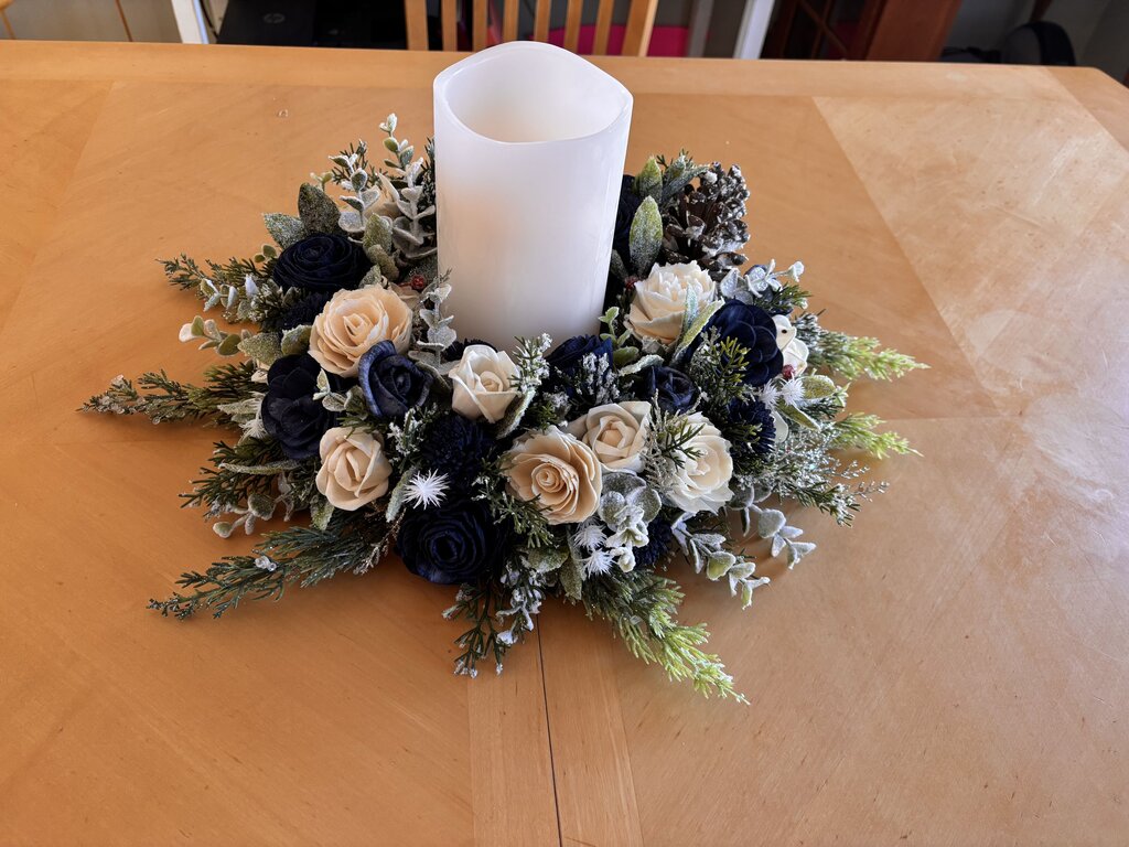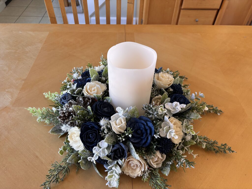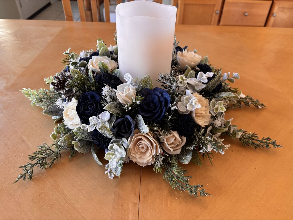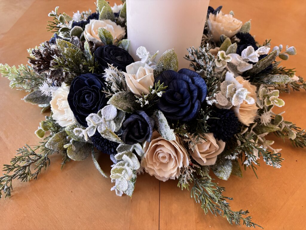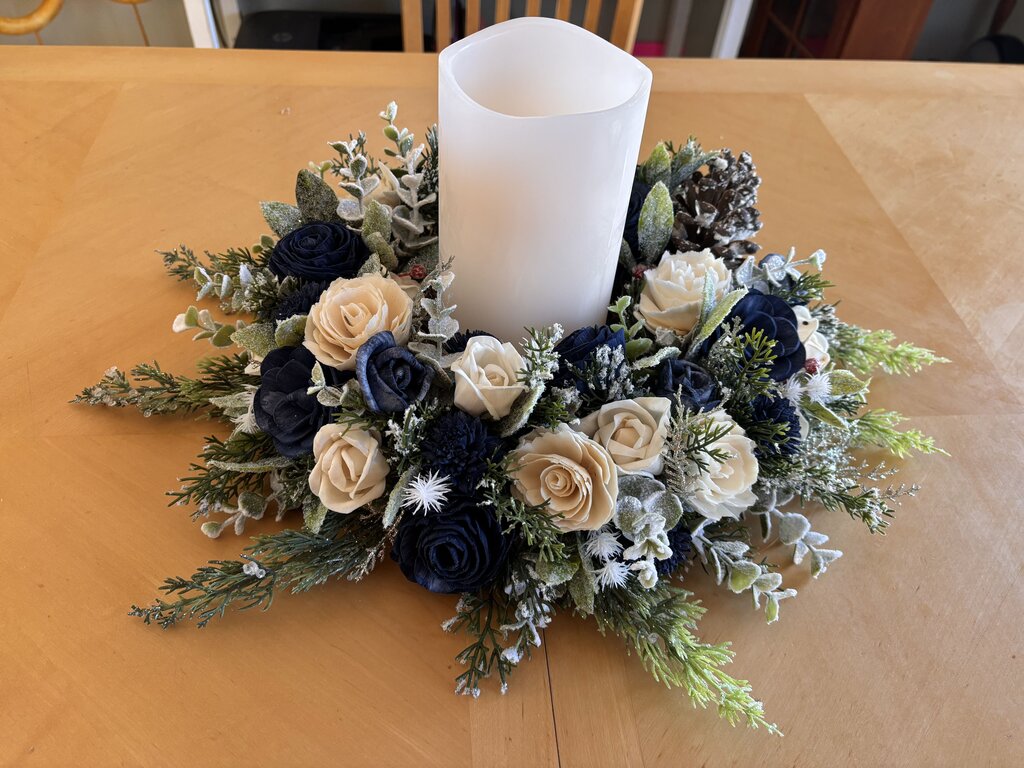 Winter Centerpiece with Candle and Blue and White Sola Wood Flowers