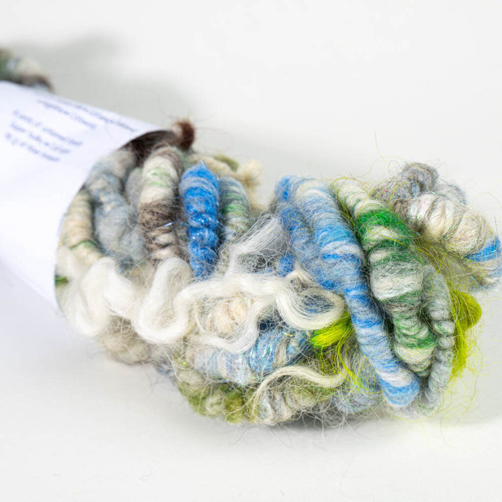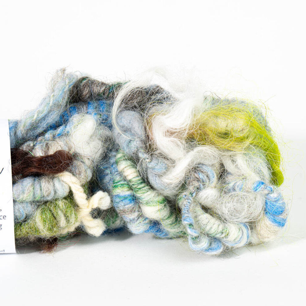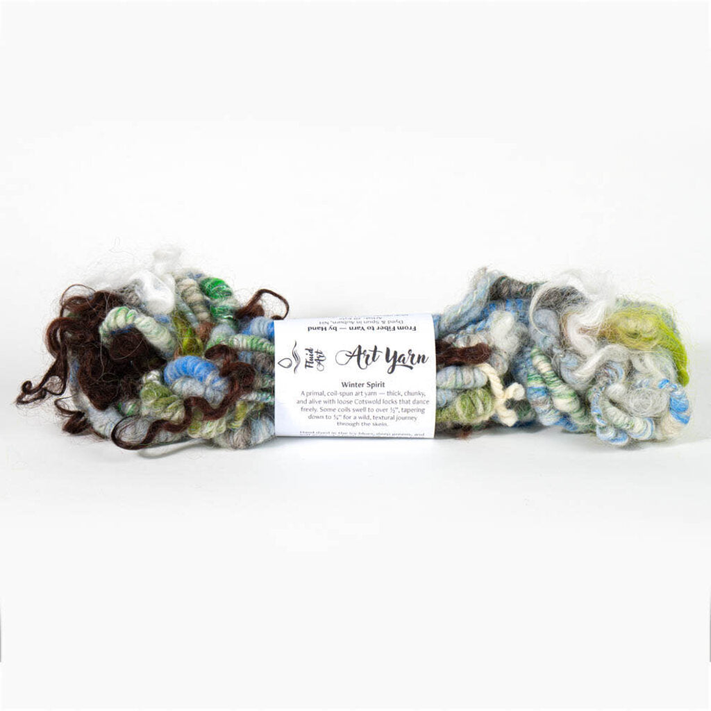 A primal, coil-spun art yarn - thick, chunky, and alive with loose Cotswold locks that dance freely. Some coils swell to over 1/2", tapering down to 1/4" for a wild, textural journey through the skein. Hand dyed in the icy blues, deep greens, and soft grays of a fresh snowfall over pine trees and frozen wetlands. Fiber: Merino ? Tussah Silk ? Gotland ? Falkland ? Angelina ? Cotswold 8 yards of untamed beauty Super bulky ? Coil spun 85 g of fiber treasure