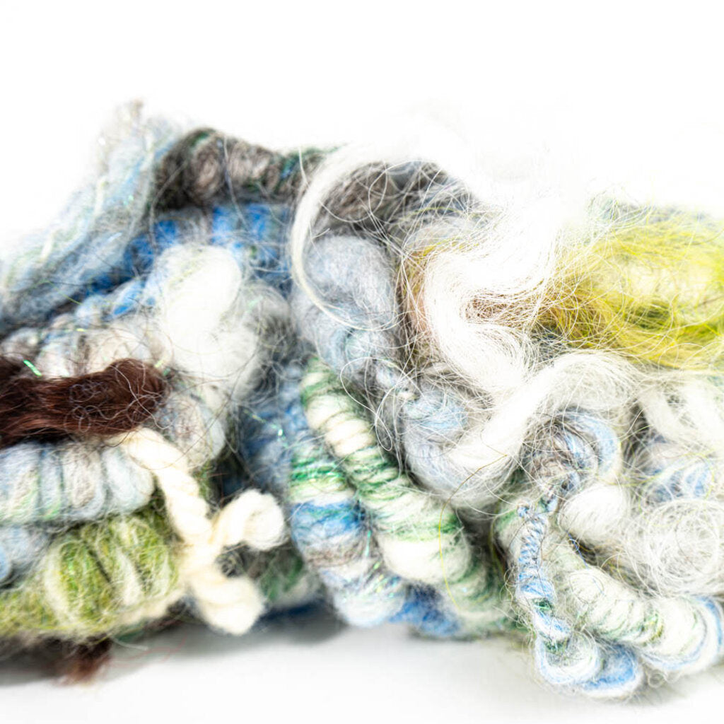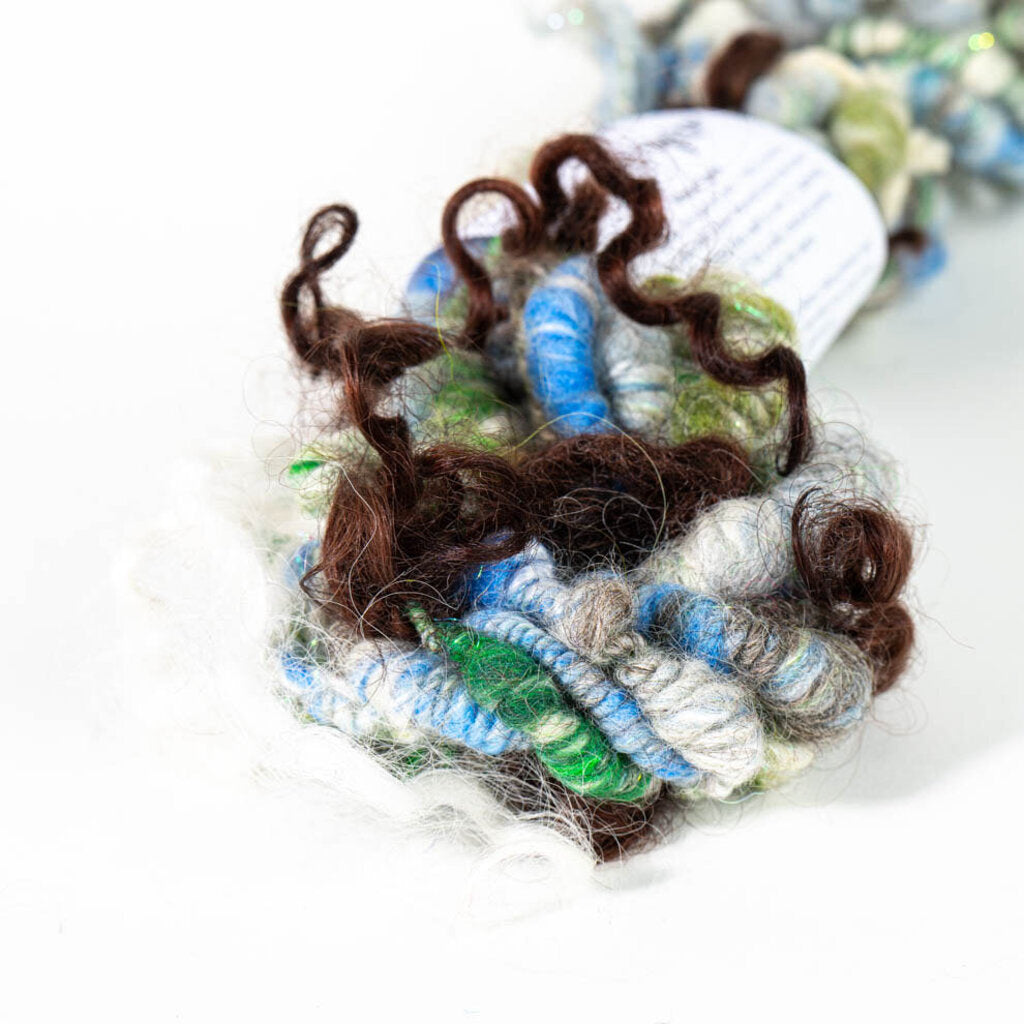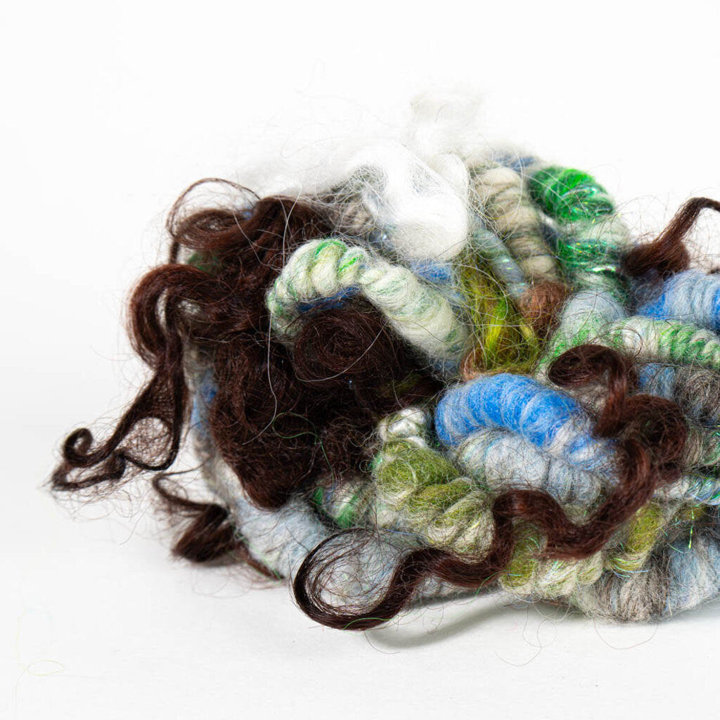 A primal, coil-spun art yarn - thick, chunky, and alive with loose Cotswold locks that dance freely. Some coils swell to over 1/2", tapering down to 1/4" for a wild, textural journey through the skein. Hand dyed in the icy blues, deep greens, and soft grays of a fresh snowfall over pine trees and frozen wetlands. Fiber: Merino ? Tussah Silk ? Gotland ? Falkland ? Angelina ? Cotswold 8 yards of untamed beauty Super bulky ? Coil spun 85 g of fiber treasure