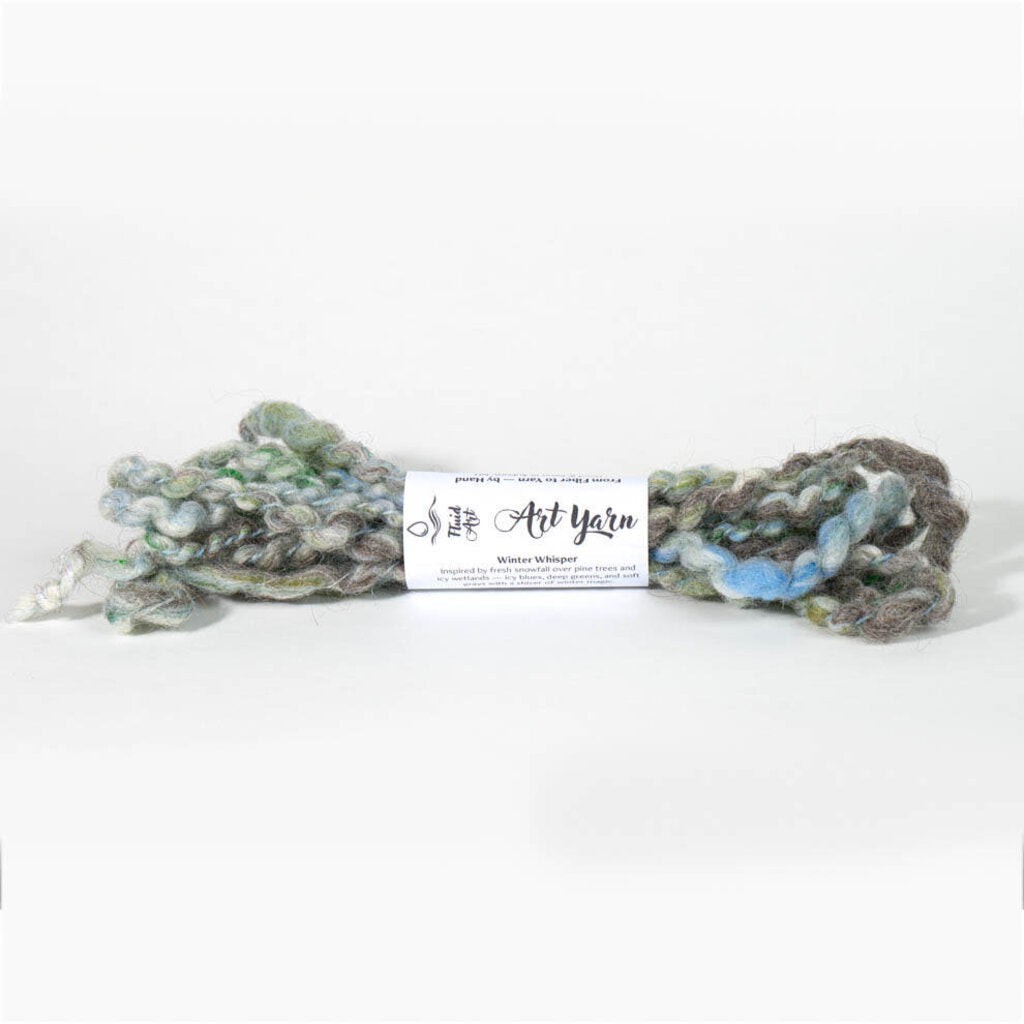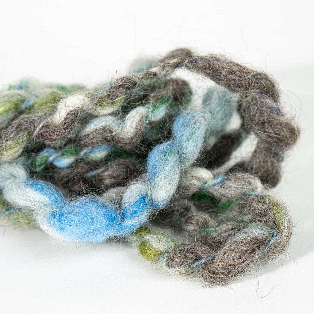 Inspired by fresh snowfall over pine trees and icy wetlands - icy blues, deep greens, and soft grays with a shiver of winter magic. Lofty, spiral-spun novelty yarn with a hint of sparkle. Fiber: Merino ? Tussah Silk ? Gotland ? Falkland ? Angelina Hand dyed in small, dreamy batches. 2.5 yards ? Super Bulky 18 g of fiber treasure