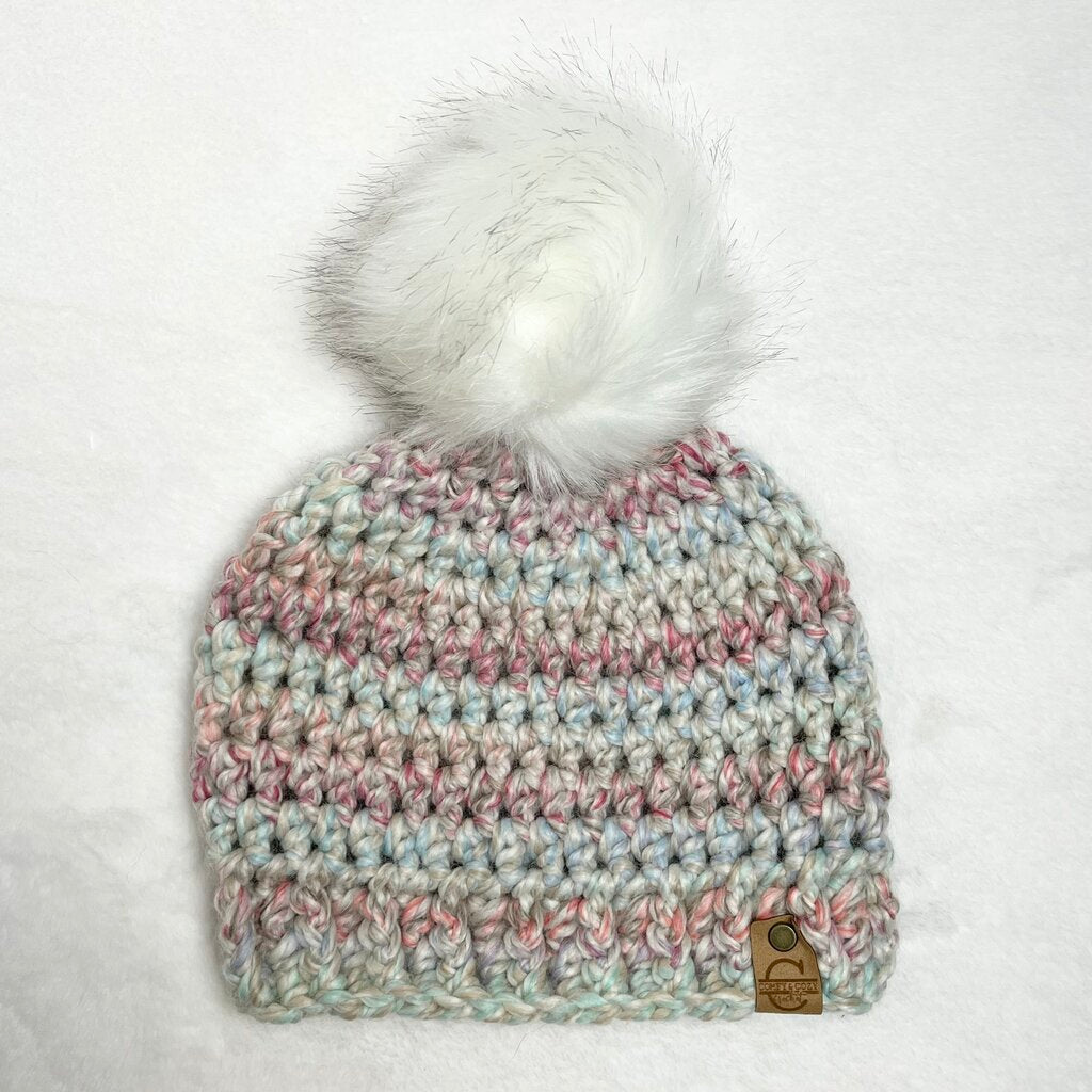 Crochet winter hat. 80% acrylic / 20% wool. Remove pom pom before washing. Machine wash cold on gentle cycle. Lay...