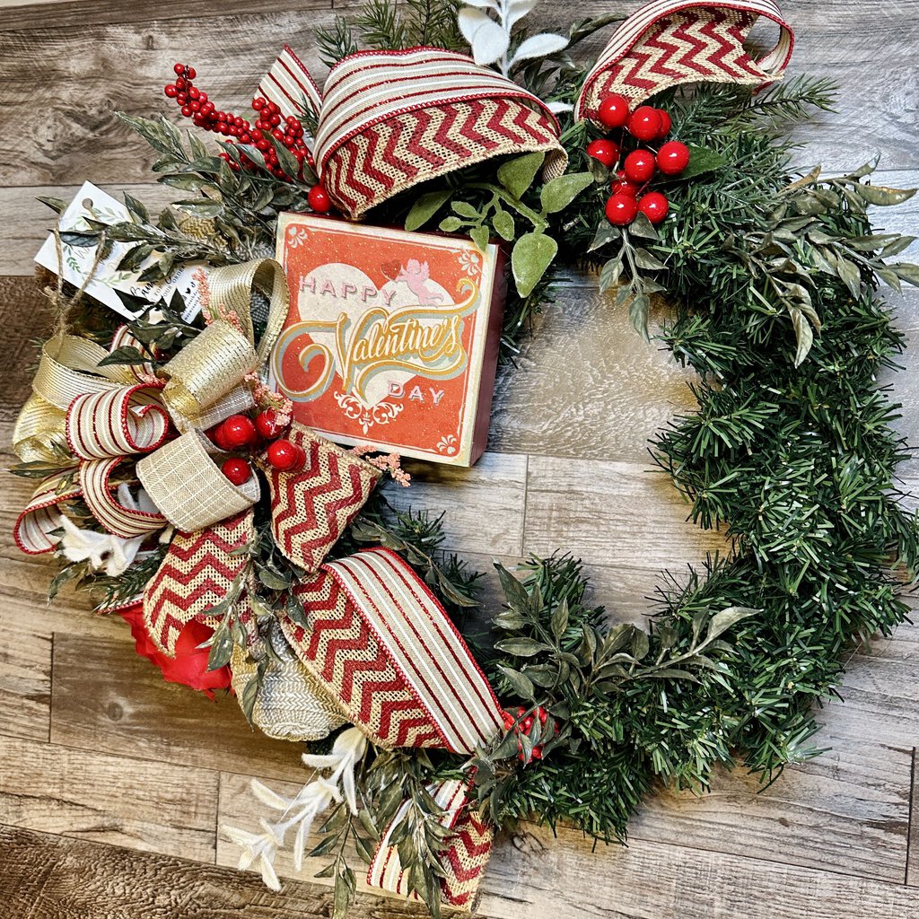 Happy Valentine's Day wreath with a vintage-inspired sign and large handmade bow! This beauty is made on an 18-inch faux evergreen wreath base and has a gorgeous bow, ribbons, roses, florals, and greenery. It would look amazing on your front door! It measures 20 inches around and 8 inches deep. One of a kind and perfect for your Valentine, Galentine or holiday decorating!