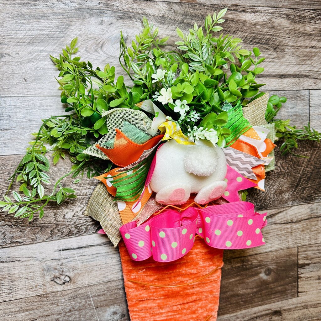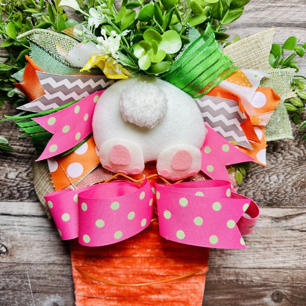 Yarn Carrot Wall Hanging with Greenery, Flowers & Bunny Butt, Easter Door Hanger, Spring Door Decor