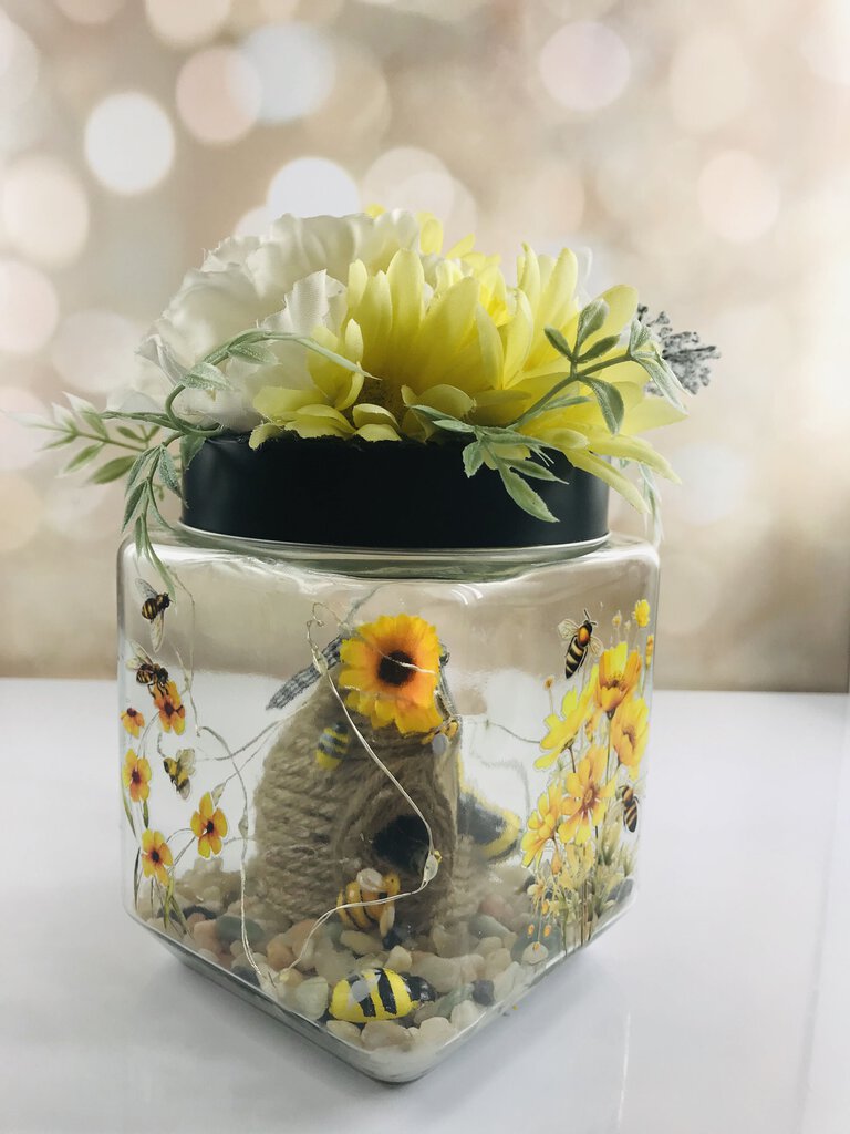 Square glass jar with bees at work! Flowers and bees on sides and yellow/white silk flowers on top. Battery operated...